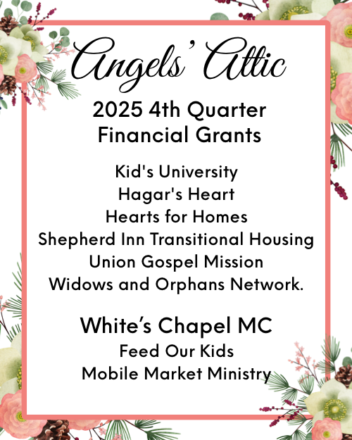 Where does the money go? Every year Angels’ Attic funds grants to charitable projects with the proceeds from the sale of the merchandise you donate and buy. Thank you to our generous donors and loyal customers who help us make a difference.